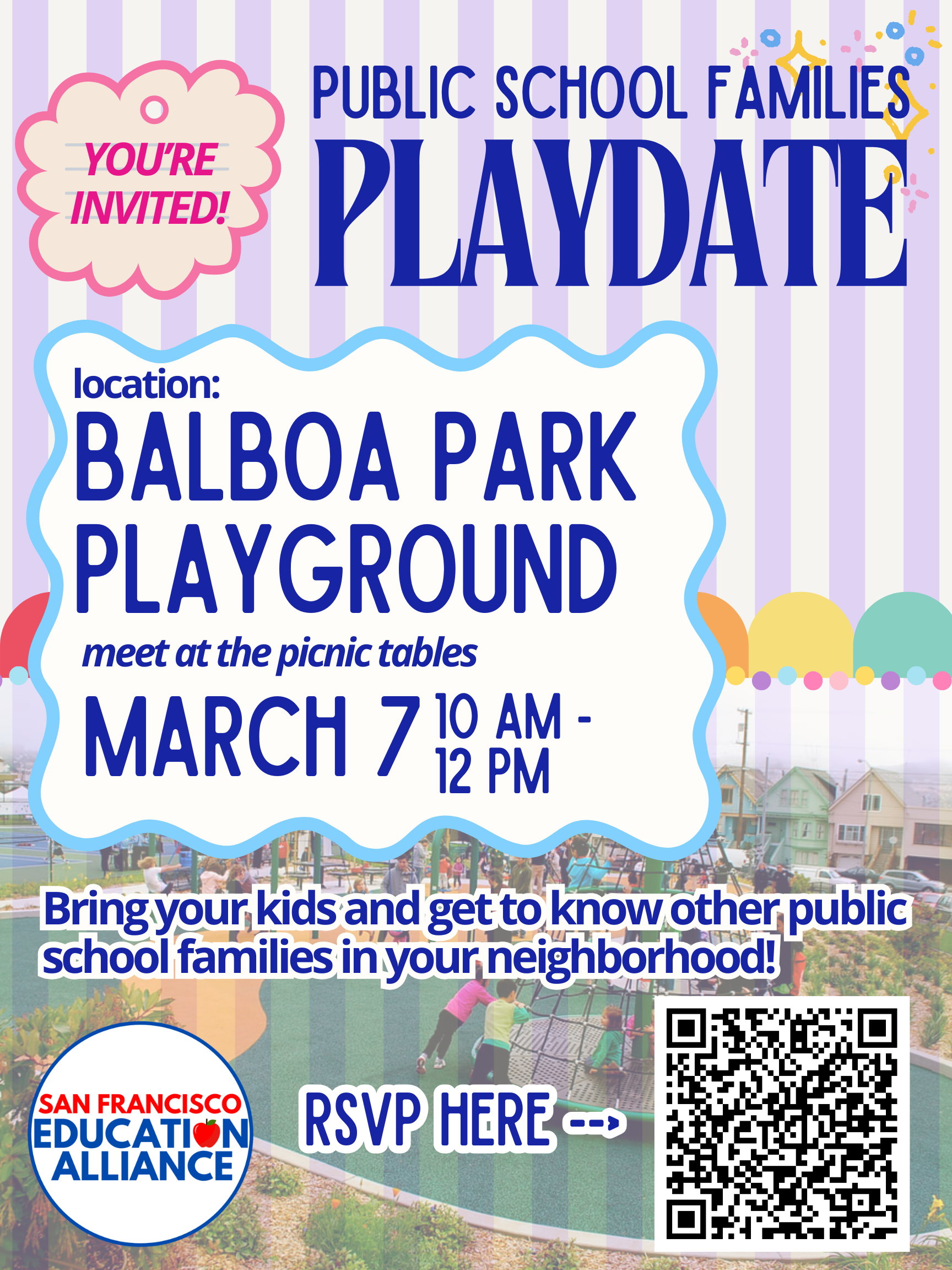Come join us for a playdate at Balboa Park! Bring your kids and get to know other public school families in your neighborhood. Snacks will be provided!